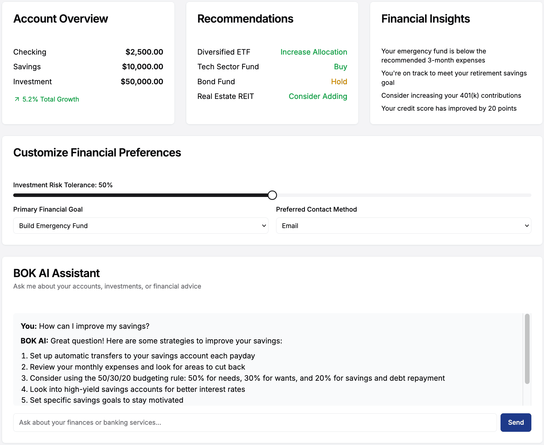 BOK strives to help users through the learning component available in app, although does not actively suggest or refer users to investments. Users will just choose the areas of investment based on categories of interest. The content section will serve as a hub where users can develop and foster their understanding and knowledge of finance